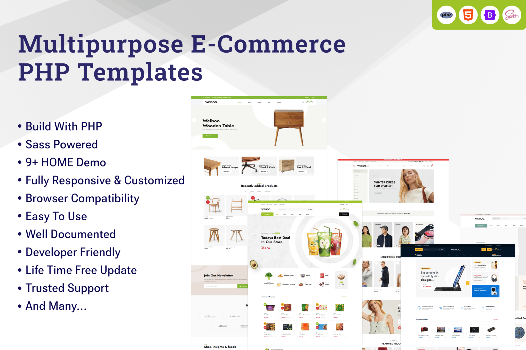 Introducing Weiboo, a sleek and contemporary eCommerce PHP template designed to elevate your online store presence. With its stunning visual aesthetics and distinct features, this template is ideal for various eCommerce niches such as Fashion, Accessories, Furniture, Electronics, and more. Boasting 10 prebuilt home pages and a plethora of inner pages like shop, cart, checkout, and team layouts, Weiboo offers a comprehensive set of tools to kickstart your online business. Built on Bootstrap 5, this template ensures 100% responsiveness and easy customization. Enjoy a seamless user experience with features like product quick view, sticky menu, and clean code structure. Get dedicated 5-star support, detailed documentation, and access to essential resources like Google Fonts and FontAwesome icons. Elevate your online store with Weiboo today!