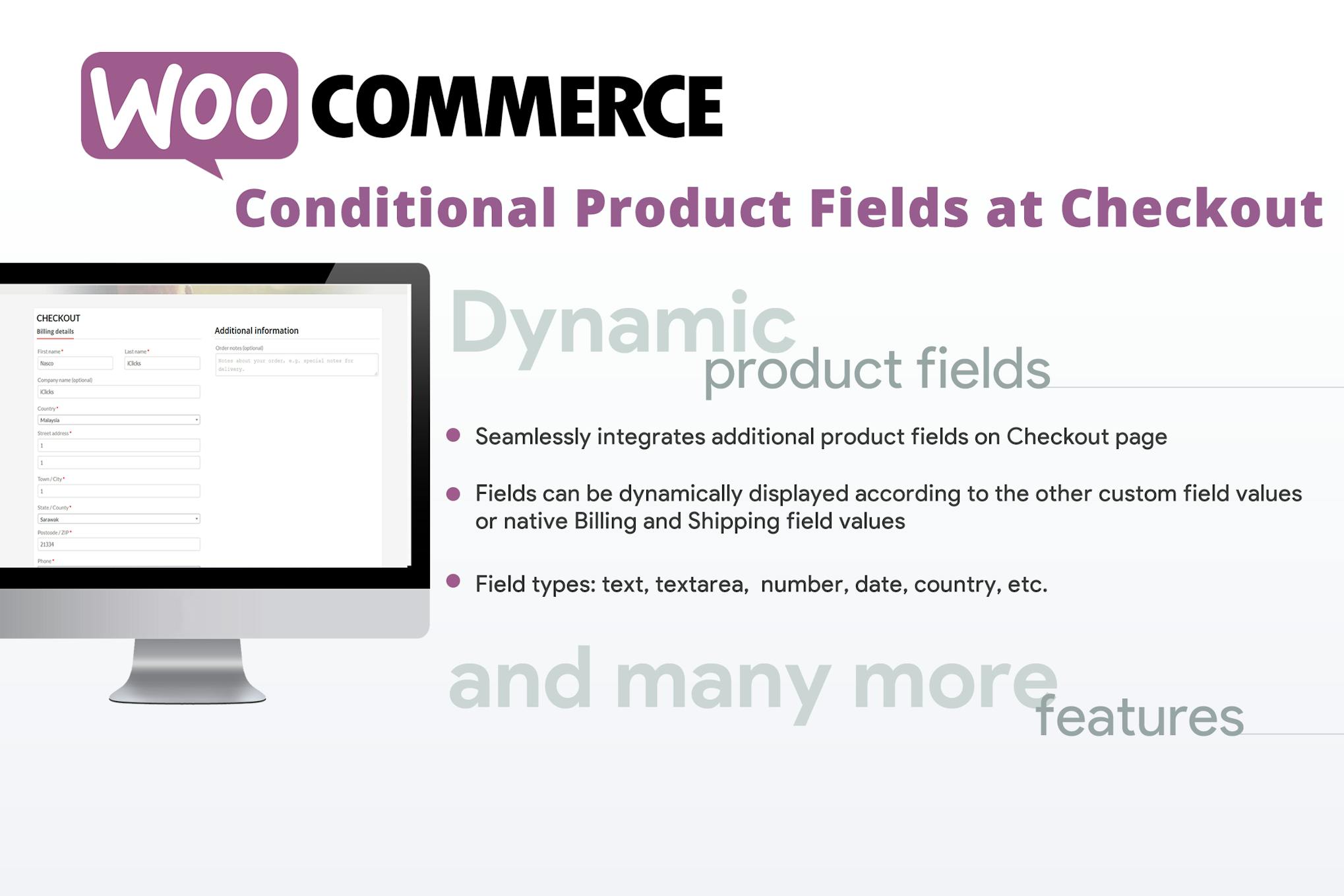 The WooCommerce Conditional Product Fields at Checkout plugin enables you to add extra product fields during checkout using a visual editor. You can create fields with conditional rules based on billing information, shipping details, and payment methods. Each field can be displayed once per order, per product, or based on cart quantity. For example, you can show a field only for customers in Italy or when using PayPal. The plugin supports various field types like text, date, select, and country, with options to customize appearance and visibility based on products or categories. Fields can be positioned after billing details or shipping forms, with additional conditional logic for dynamic display.