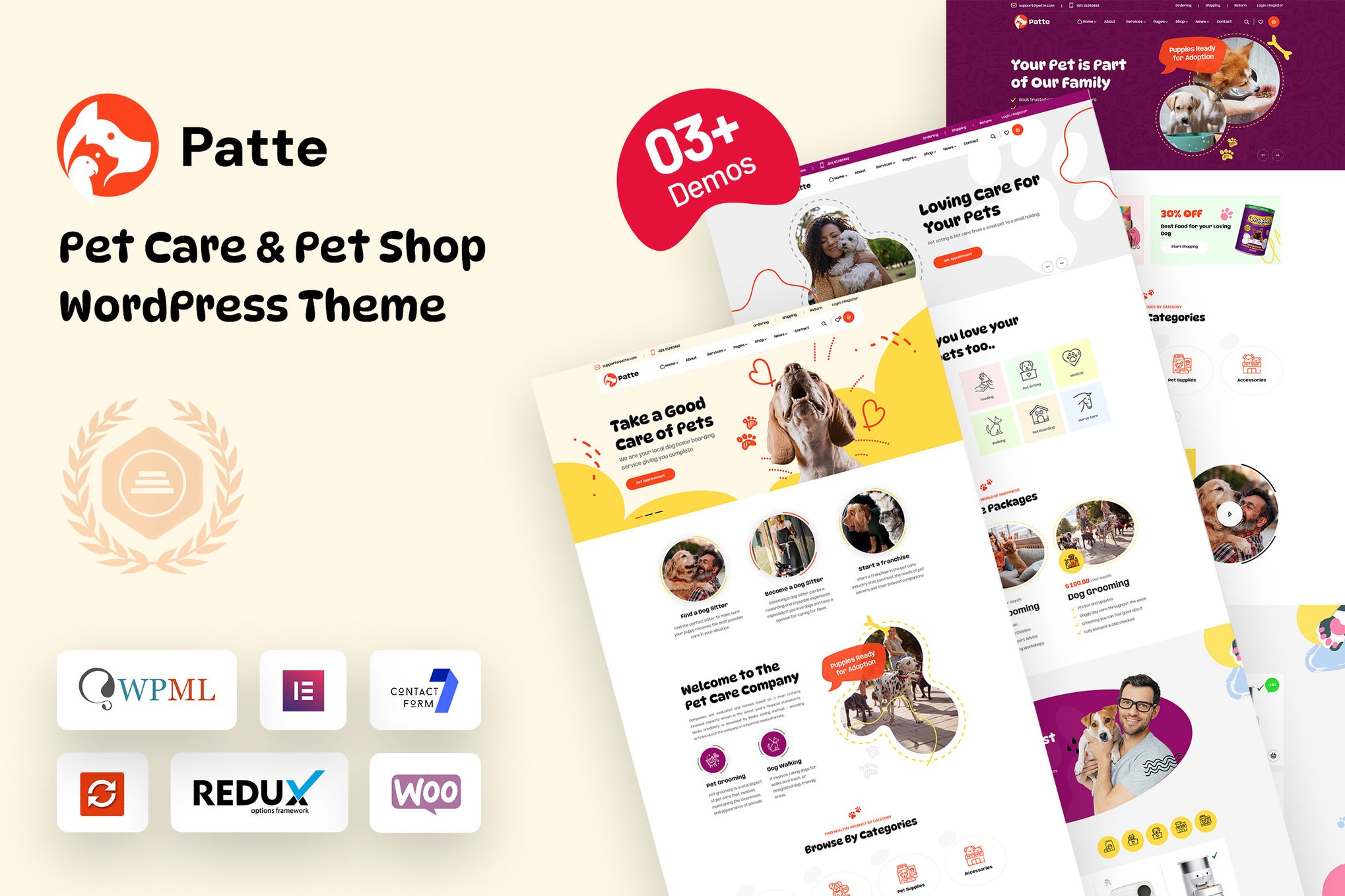 Patte is a versatile Pet Care & Pet Shop Theme designed for businesses like pet food shop, animal center, and vet medical shop. It offers 03+ Homepage Concepts, Elementor page builder, one-click installation, Mega Menu, Slider Revolution plugin, WPML compatibility, Contact Form 7 support, and more. The theme includes features like responsive design, custom widgets, WooCommerce compatibility, Google Maps integration, FontAwesome icons, and a sticky header. With advanced theme and page options, unlimited color choices, parallax effects, and detailed documentation, Patte provides a seamless website-building experience for pet-related businesses.