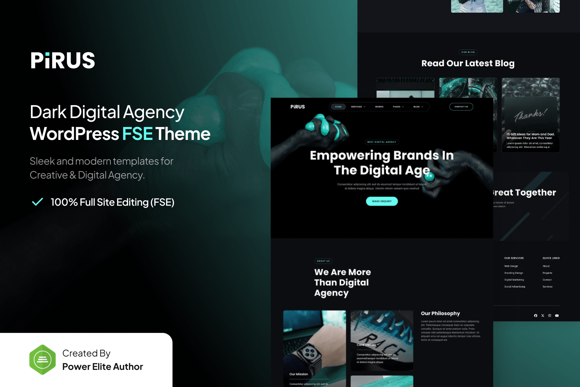 Introducing Pirus, a sleek and modern WordPress theme tailor-made for Creative Agencies, Digital Agencies, Online Portfolios, Designers, and Freelancers. Compatible with the powerful Block Editor, Pirus offers advanced features that are effortlessly customizable to meet your business requirements. In today’s competitive digital landscape, having a visually appealing and user-friendly website is crucial. Pirus simplifies this process by providing an intuitive Full Site Editing experience, allowing you to create dynamic and responsive websites without the need for extensive coding knowledge. With benefits like full site editing, an extensive template library, lightning-speed performance, SEO friendliness, responsive design, lifetime updates, and dedicated support, Pirus empowers you to build a standout website that enhances your brand, saves time, boosts visibility, and strengthens customer loyalty. Elevate your online presence with Pirus – the Dark Digital Agency WordPress FSE Theme and leave a memorable impression on your audience. Experience the perfect blend of style, functionality, and user-friendliness in one theme. Transform your website today with Pirus!