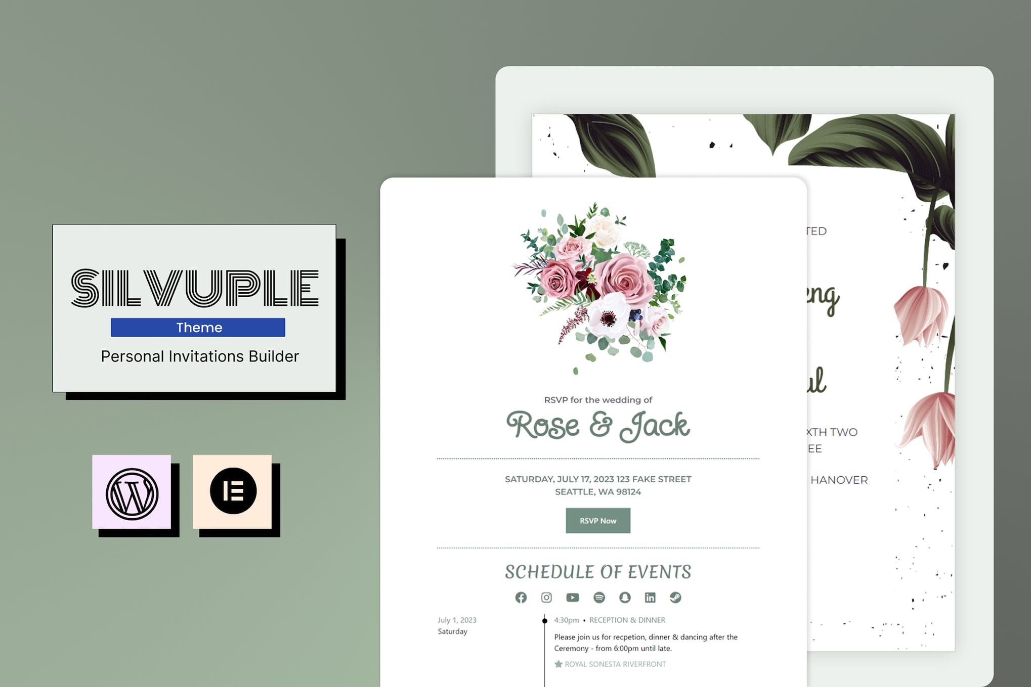 Introducing Silvuple: The Ultimate Invitations and RSVP WordPress Theme. Elevate your event planning experience with limitless customization options, exquisite designs, effortless deployment, and streamlined communication to ensure your special occasions are truly unforgettable. With customizable invitation pages, social media integration, and call-to-action buttons, you can create stunning and personalized invitations that drive specific actions. The responsive and mobile-friendly design guarantees a seamless user experience across all devices. Say goodbye to monthly fees and enjoy easy installation, setup, and translatable features. Get ready for Silvuple: the theme that’s changing the game in event planning.