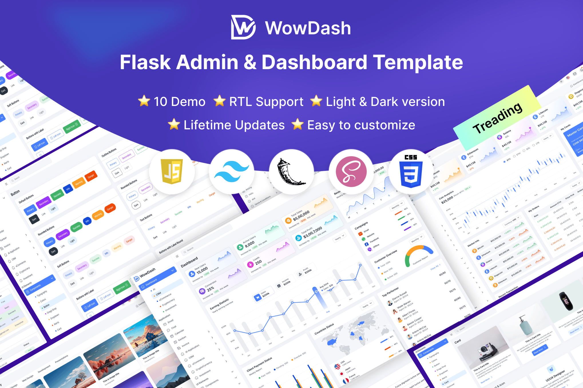 Introducing WowDash – a versatile Flask admin dashboard template designed to meet the needs of diverse web applications such as analytics, eCommerce, and project management. With its modern and responsive design, WowDash ensures a seamless user experience for both administrators and developers. Customize and scale effortlessly to create dynamic and high-performing dashboards with ease. Featuring multiple dashboard layouts, dark and light modes, advanced charts, and customizable UI components, WowDash provides a professional and user-friendly solution for creating robust web applications. Elevate your projects with WowDash’s comprehensive features, including responsive and retina-ready design, clean layout, and extensive customization options. Stay ahead with regular updates and dedicated support to address any customization needs.