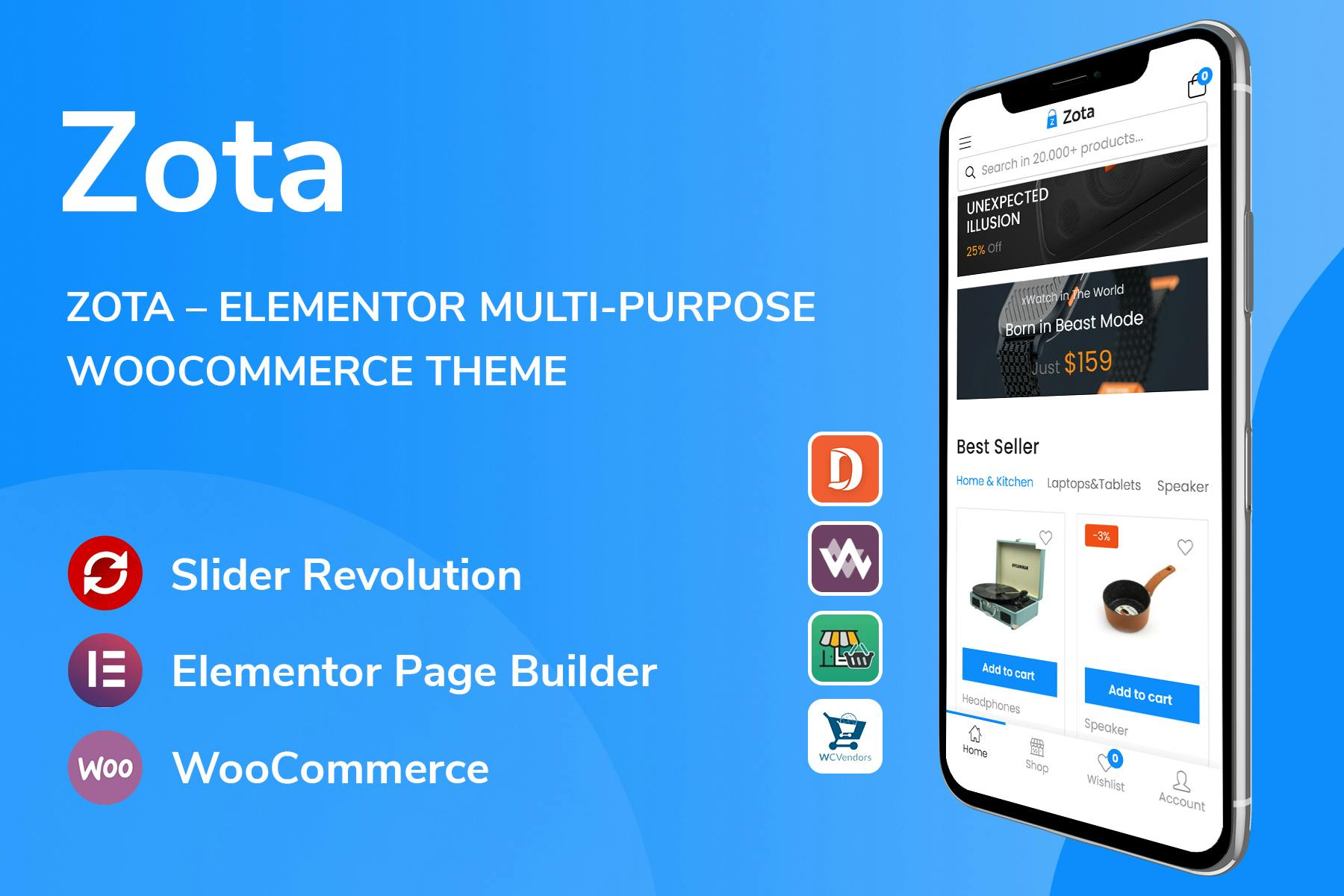 Zota is a versatile and customizable WooCommerce Multi-Purpose WordPress Theme that streamlines installation and customization through its powerful Theme Options. Designed with Elementor, this theme allows you to swiftly personalize your website without delving into any code. The inclusion of a Header & Footer builder with Elementor empowers you to effortlessly tailor these sections to your liking, marking a standout feature of Zota. This theme stands out as a “Marketplace WooCommerce Theme,” boasting full compatibility with renowned plugins like Dokan, WC Marketplace, WCFM, and WC Vendors, enabling you to establish your marketplace akin to leading platforms in less than 30 minutes.